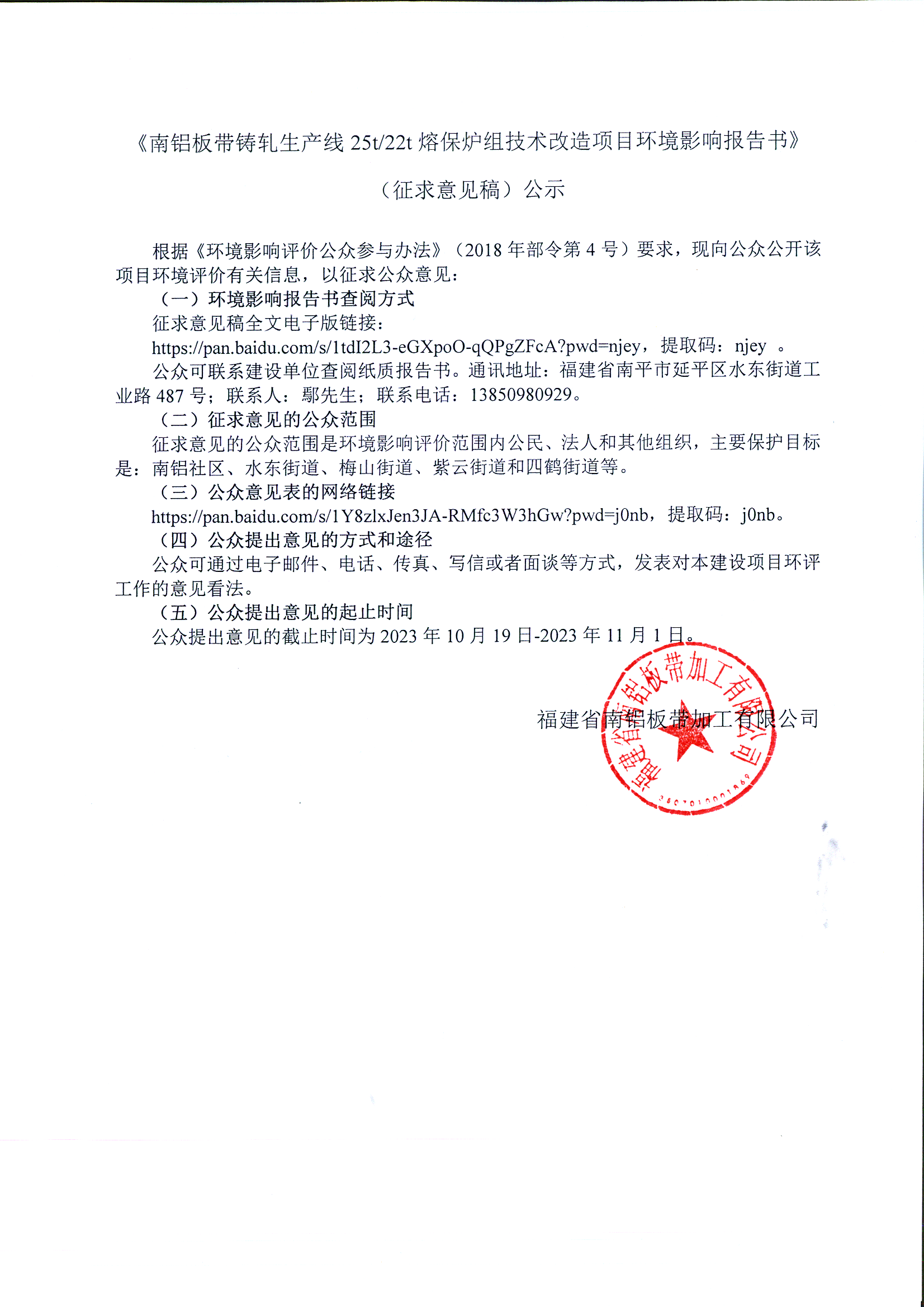 《南鋁板帶鑄軋生產(chǎn)線25t22t熔保爐組技術(shù)改造項目環(huán)境影響報告書》報批前公示